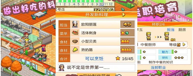 在游戏中玩家就会拥有一家美食店铺,在这里可以做日本料理,可以做中餐,还有西餐,甚至还可以去开发一些全新的食谱,例如鲜奶雪糕,还有奶酪蛋糕等等,全球每一个不同地方的美食都可以出现在游戏,能有效去满足每一个人都有临时的想法。玩家还需要逐渐的精益求精,才能够去有效征服一些不同的客人。