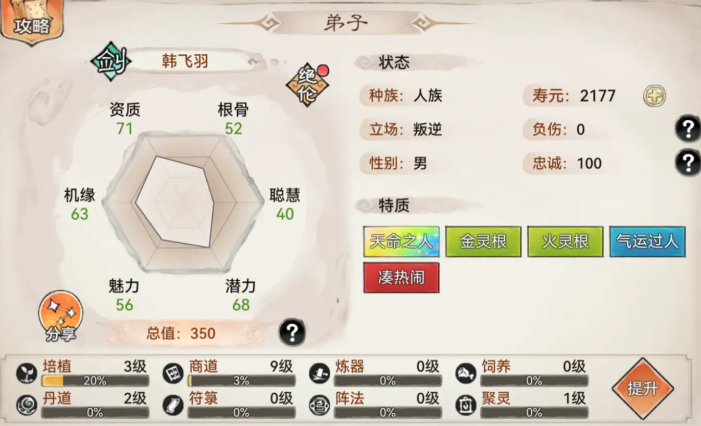 大家在招收弟子的过程当中,可以看到,每一位弟子的战斗属性,天赋和性格等等方面都是不同的。这些属性嗾使完全随机的,每一个弟子都拥有其独特的闪光点和天赋。修仙就是这样,在招收弟子,观察他们修仙的同时,也能体验到别样的趣味。