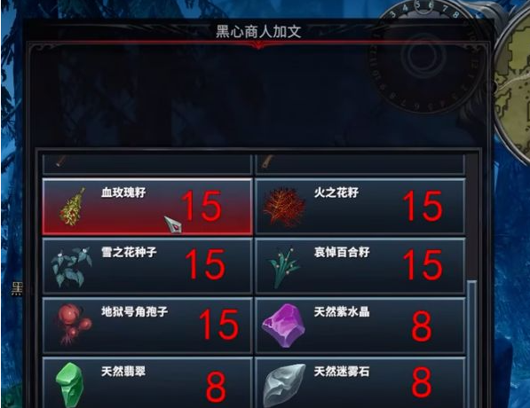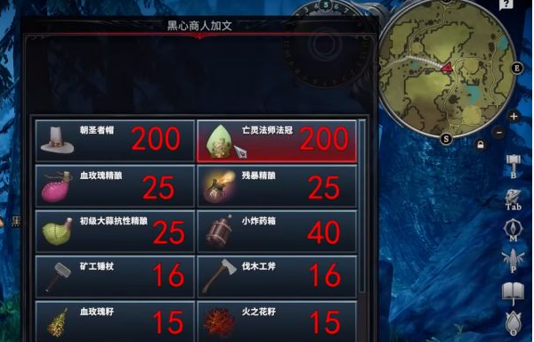 黑心商人这里购买的主要就是各类的工具和材料,还可以购买天然宝石或者是朝圣者的帽子,亡灵法师法冠。如果玩家对这些东西有兴趣,就可以找到商家的所在位置,找到位置之后就可以通过购买的方式获取。