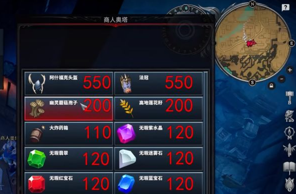 奥塔这一个商人的位置是固定的,并不会出现变化,玩家在这里就可以购买阿什福克头盔另外也可以购买无瑕宝石。