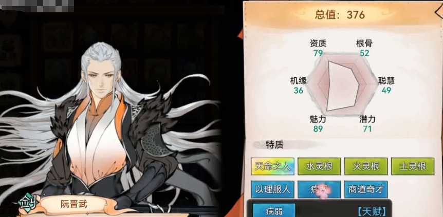 这个弟子一样也是一个人族的逆天弟子,在基础的天赋上面其实跟骨的数值很高,但是资质上面的数值就比较差,但是他最主要的用处其实还是在开荒上面,因为他基本的几个特质都是偏向于开荒的天赋,比如灵根上面就是拥有金灵根、木灵根以及土灵根,不管是用来种植灵草还是去炼丹都是不错的选项,而且本身还是自带了一定的社牛属性,目力过人的同时可以带来更多的资产加成,因为他还有一个大财迷的效果加成,战斗上面一样也可以利用霸王枪给大家带来更多加成的哦。