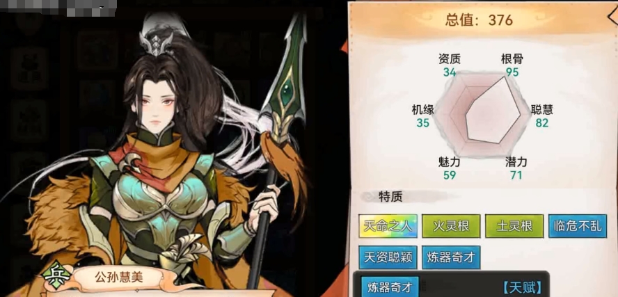 这个逆天弟子一样也是一个女性角色,但是她的作用就比较偏向于战斗,所以很多新手玩家其实是比较推荐大家选择她的,在基础的资质上面也是跟骨奇佳的,在灵根上面虽然只有火灵根跟土灵根,但是在效果上面非常不错,比如临危不惧的效果可以让她在生命低于30%的时候效果抗性提升,而天资聪颖也可以带来5点的聪慧数值,最后的炼器器材天赋则是可以在炼器的时候获取20%的额外经验哦。