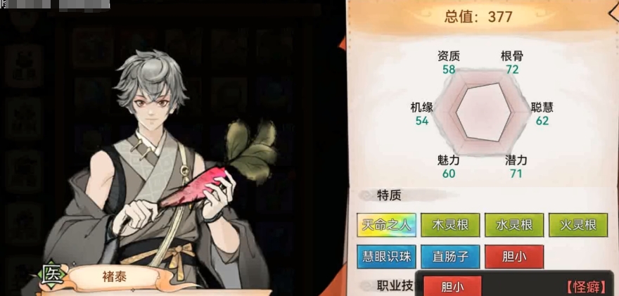 这个弟子虽然是男性人族弟子,但是其实在使用上面是比较偏向于奶妈的,所以在技能上面也是一些恢复技能,整体的资质都是比较平均的,在灵根上面拥有木灵根、水灵根以及火灵根,而在天赋上面有着慧眼识珠这个天赋,这个天赋在上面是根据他使用的武器来产生效果的,如果使用的武器是宝珠在上面就可以保证自己的治疗效果增加10%,直肠子这个天赋则是可以帮助减少丹药上面的消耗,最后的胆小天赋则是可以让大家在上面使用褚泰的时候站在后排提升自己的速度效果。