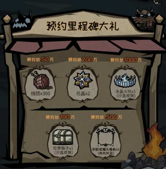 预约人数达到200万时,玩家拥有兑换两个元晶的名额达到500万预约时会获得一个非常珍贵的头像相框。达到最终1,000万的预约的时候,玩家会获得一个非常稀缺的沙盒皮肤,总体而言,此次预约礼包总共包含4个角色装扮以及两个珍贵皮肤。