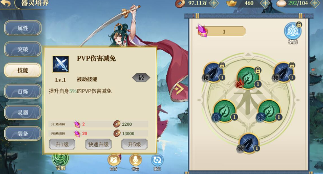 点击解锁的技能,然后进入到迅速的升级阶段。接着还可以有效提升百炼等级,在每一次提升时都能有效增强物理、攻击暴击率以及生命等属性。接着就可以选择装配灵器,在装配完毕之后就可以有效强化灵器。
