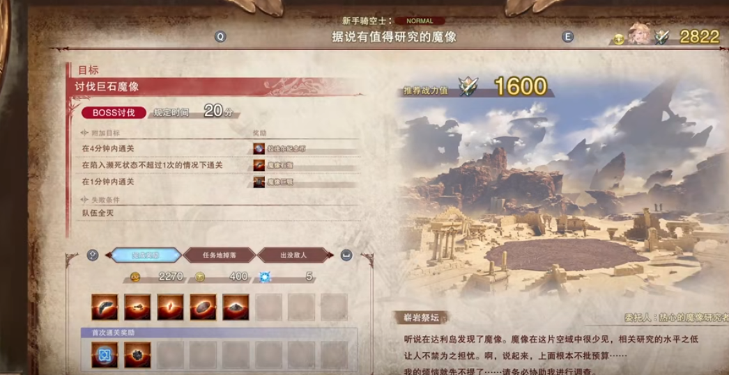 完成这个任务玩家需要上交一个魔像石指才能完成任务,玩家在前期游戏中如果收集到多余的魔像石指上交1个就可以完成任务,如果没有这个道具的玩家点开任务中心接取讨伐巨石魔像这个任务,完成这个任务有一定的几率会掉落魔像石指。