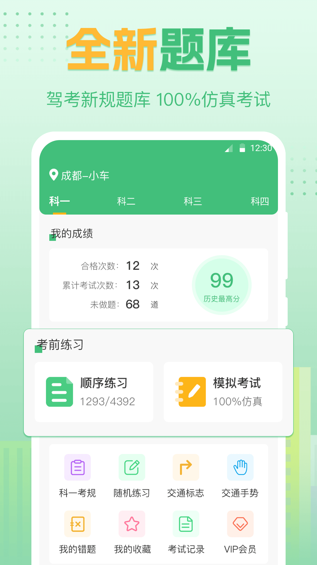 在这个驾照考试软件上采用了最新的规定。拥有最新的科目一和科目四的题库,而且还会根据不同考生的不同驾照考试类型提供相应的考试题型。根据章节练习,强化训练以及模拟考试,让考生能够更轻松的通过考试。