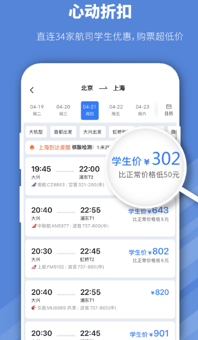 如果学生在上学或者是旅游的时候,需要乘坐飞机票,当然是越便宜越好了,这款软件就是专门为学生设计的,只要提高自己的身份信息,符合优惠条件的话,就可享受很多的优惠,让学生买机票的时候特别的超值。相对于其他的购票软件来说,这款软件是国内仅有专注为大学生服务的机票app,要比其他航空公司买的更便宜,主要就是希望大学生能够顺利出行。