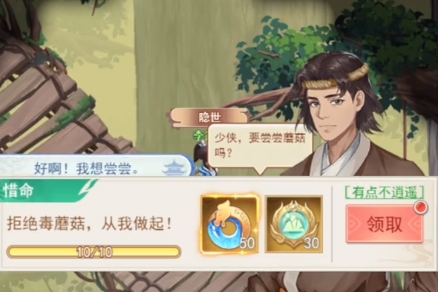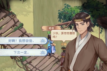 一开始进入神木林之后大家就会看见一个小贩,这个小贩会询问玩家是都需要尝尝蘑菇,这里大家可以选择选项下次一定,随后一直往这里走触发对话,一共触发10次,在上面连续拒绝10次,就会获取一个隐藏的成就就是惜命。