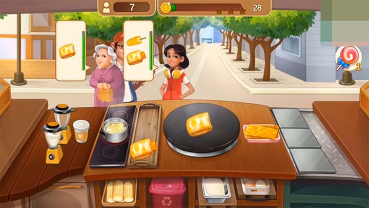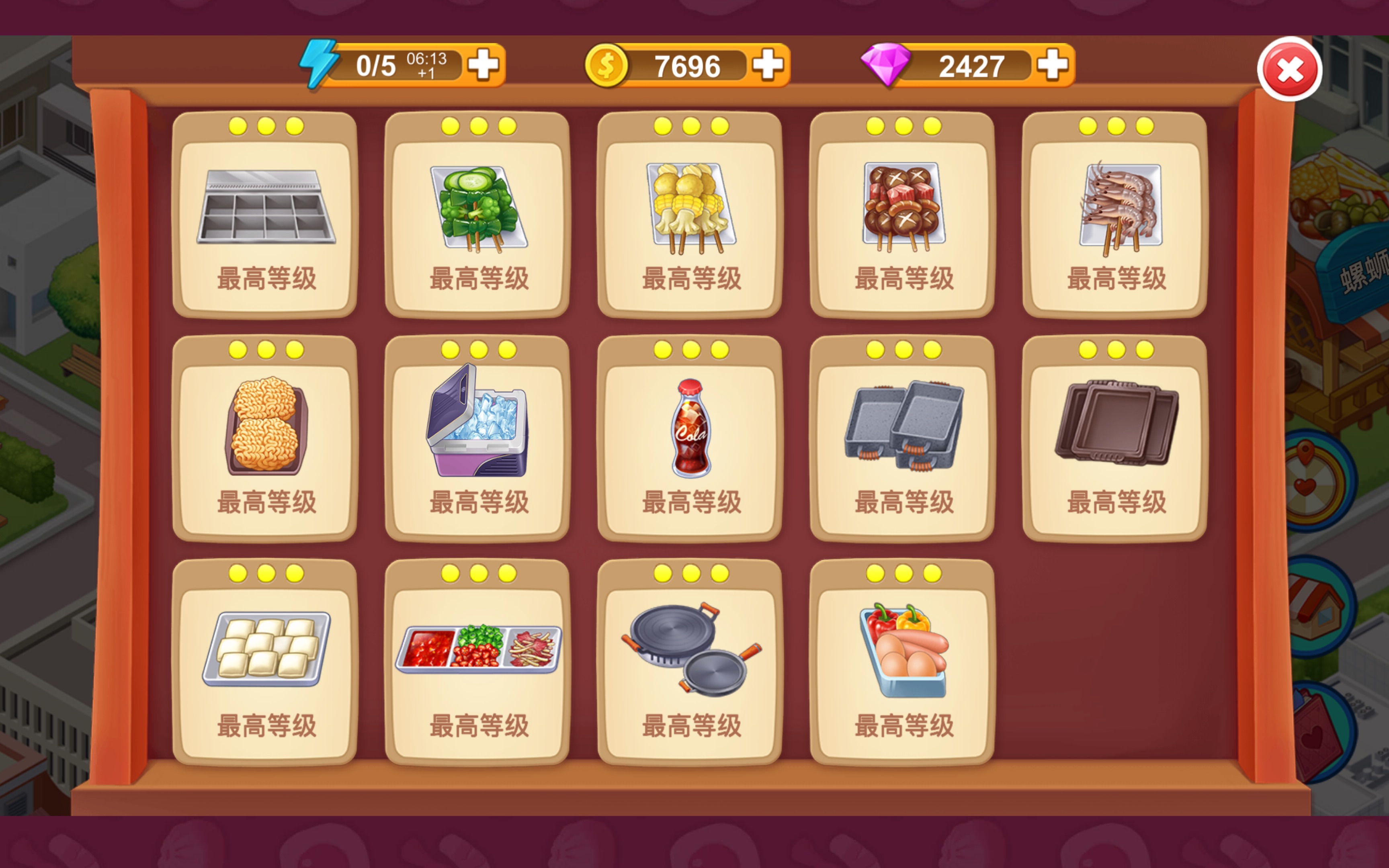 除此之外,在开始游戏之前有许多道具可供选择,有些可以帮助小伙伴们将摊位上的菜自动拿给需要的客人,而有些可以使得所有食物都不会烤糊,或者有些可以让所有菜品直接制作而成,小伙伴们在关卡开始之前可以选择自己所需要的道具,除此之外还可以对菜品进行升级,这样可以提高售价,赚取更多的金币。