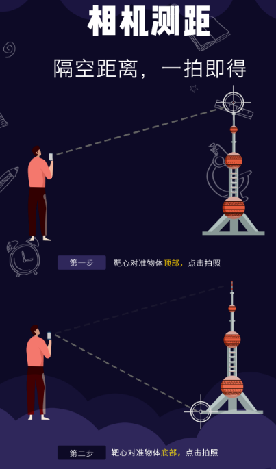 在对各种物品进行高度测量的时候,使用这款测距测量仪可准确的了解物品的具体高度测量的时候,主要就是使用传感器以及手机相机镜头来对要测量的物品进行高度和距离方面的测量。比如想了解自己的身高是多少,直接就能显示出来,也能利用自己的身高测量出物体或者是房屋以及家具的高度。