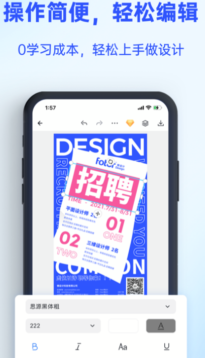 简单易操作的作图app只需三步就能完成,平面设计成为海报制作大师,在素材库中有超多模板可以选择,可修改并添加图片中的文字。