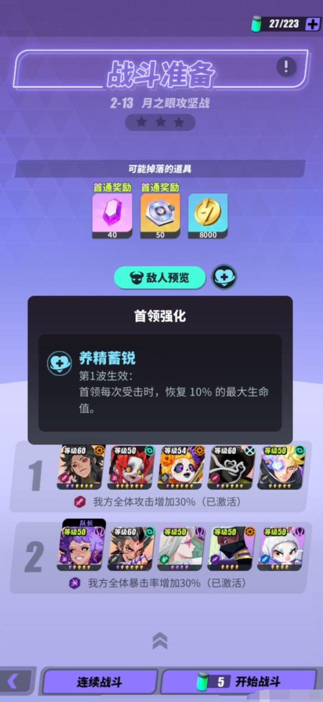 剩下的能输出、控制、治疗的角色即可,选等级高的上场。第一波只上三人,避免给首领过多的攻击机会,然后用禁疗和无法获得增益的技能限制首领的能力,再用输出和控制的技能消耗首领的血量,直到杀死他两次。