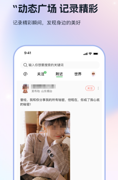 可以发现较多兴趣话题,帮你快速破冰,趁年轻来场冒险恋爱旅程,来场走心的恋爱实验。有动态广场,千万优质单身用户全面入驻,实时查看附近动态,分享个人日常。