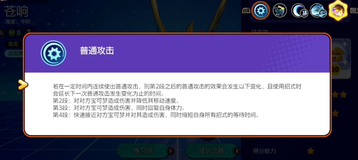 苍响是一位近战平衡型宝可梦,但是数值可非常不“平衡”,它拥有出色的基础数值和全面的技能。在游戏初期,即使只有3级,数值上也能和9级王牌相媲美,前期积极参与战斗,利用其高成长性能快速升级是至关重要的。当然这样优秀的面板也让我们在技能搭配上容错率较高,可以根据战场情况进行随时调整即可,以适应不同的战斗环境。