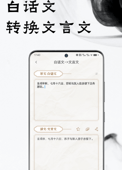 文言文是中国的古文,更是语文知识中重要知识,这是专为文言文推送出的应用,可翻译文言文以及古文。应用拥有一系列特色,可直接将古文转换成白话文,两者之间可互相转换。搜索译文之后可直接收藏,还能查看历史翻译记录,使用这款应用,可共同探索古代汉语的魅力,感受文言文的独特文化气息。
