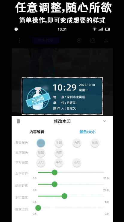 该软件使用完全免费,使用的时候操作简单,可随意调整水印的位置,完全实现随心所欲,所以能够很简单的变成自己想要的样式里面的水印模板,数量特别的多,而且都是全网使用率非常高的,比如记录工程时的水印或者是记录经纬度的水印等。如果觉得水印的字体颜色大小等不是自己满意的,也支持修改,拥有很高的用户下载量,特别的推荐。