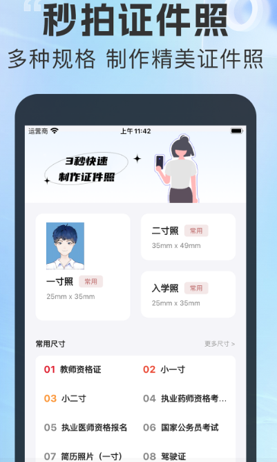功能强大的证件照拍摄、制作工具,有上百款尺寸以及颜色可随意更换,致力于打造极其专业的证件照制作平台,足不出户,快速制作专业合格的证件照片。