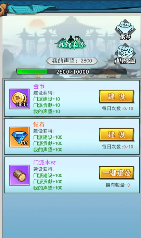 在参加门派之后,总共有三个玩法。第一个玩法:门派的建设。玩家向门派捐献一些游戏货币来获取到贡献值和声望值,这些东西在游戏商城中能兑换大量游戏道具。试炼与委托玩法能够获取到装备碎片与物质。第二个玩法:挑战宗门委托,完成大量任务得到宗门的贡献值。第三个玩法,就是修行,通过门派的加持能将玩家在游戏的修行时间提高!