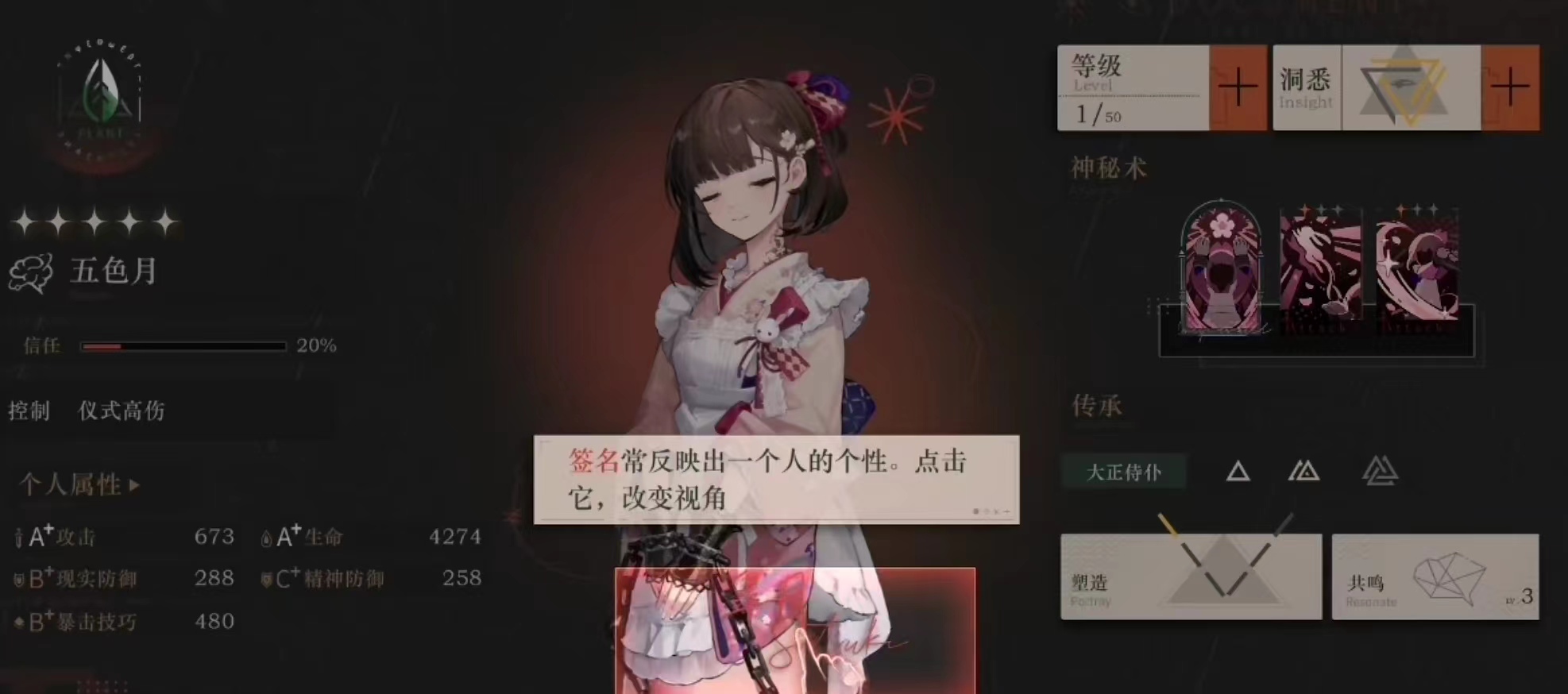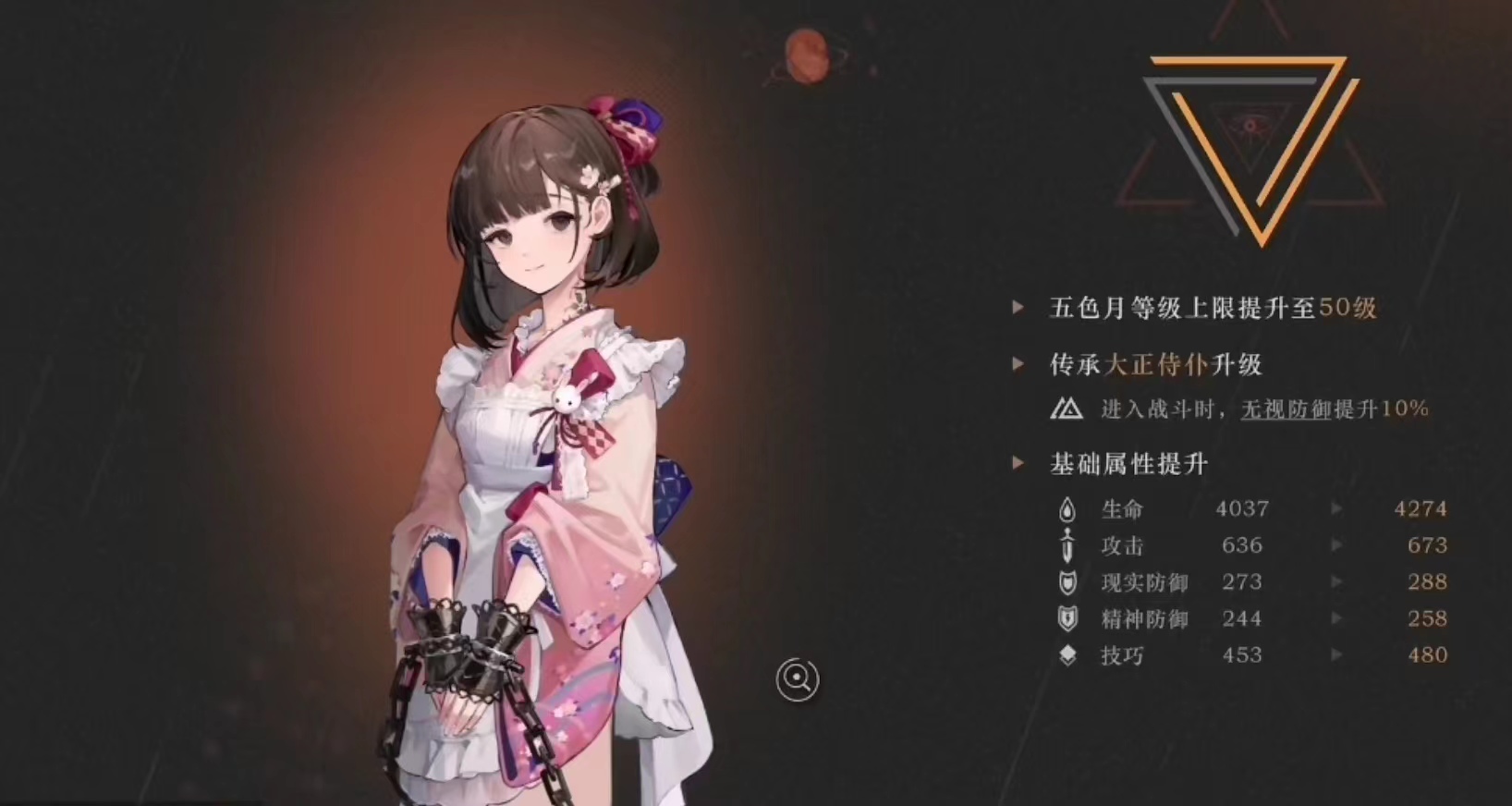 五色月整个的生命值以及攻击能力都是比较高的,设定是一个输出角色,从整个数据上面来看,不管是精神防御,又或者是现实防御,这两者都是偏弱一点,但是对于输出角色来说也是很正常的一个数值。