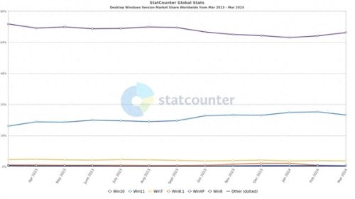 近日,根据最新发布的统计机构Statcounter报告显示,Windows 11在2024年1月份达到最高点后,在2月份出现了明显的下滑,从28.18%降至26.72%(下降了1.46个百分点)。与此同时,Windows 10重新吸引了一些失去的用户,市场份额增加了1.81个百分点,达到了69.04%,自2018年1月份以来,Windows 10的市场份额终于超过了Windows 7,此后长期雄踞第一操作系统的宝座。
