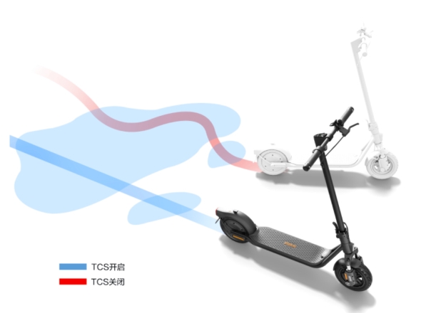 值得注意的是,九号电动滑板车F2升级版引入了TCS(牵引力控制系统)技术,通过更精密的电控算法与三轴传感器的运用,实现更精准的车辆牵引力控制,提高车辆的稳定性和操控性,即使露营骑行时遇到湿滑路面,也能有效减少滑倒的风险。
