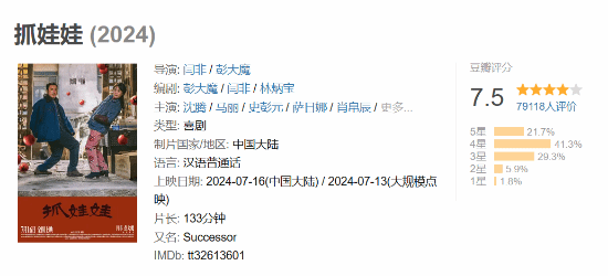以上,便是小编收集到的有关《抓娃娃》豆瓣开分7.5分的全部内容,对这部电影感兴趣的朋友们可以关注一下,那么,让我们下期再见。