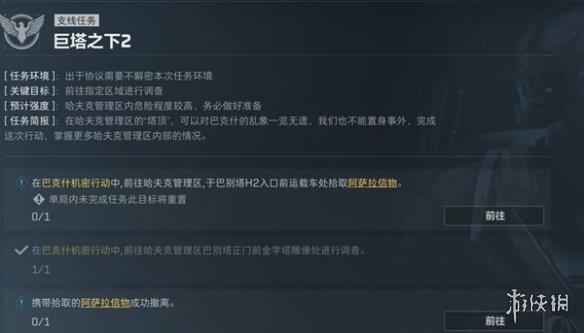 玩《三角洲行动》时,要完成巨塔之下·二任务,记住三步走:先去巴别塔正门前的金字塔雕像,调查一下,然后到塔的H2进口附近,找到运载车上的阿萨拉信物木雕,最后带着这个信物成功撤离巴克什地图就搞定啦。