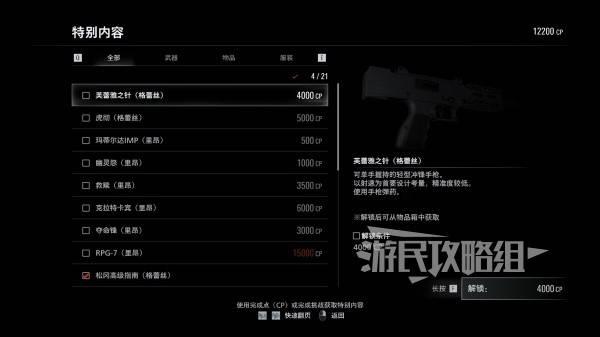 通关癫狂难度获得40000CP以【癫狂难度】通关可以获得40000CP点数,CP点数可用来在【特别内容】列表中解锁武器、道具和模型,想要全收集的话需要消耗大量CP点数。由于难度较高,建议在购买【无限耐久近战/无限弹药】后再进行挑战。