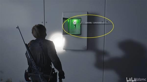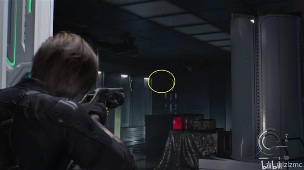 重新回到生物武器储存室11,开门看到里面有舔食者,这里用一个方法全暗杀或者一发麦林枪子弹全秒掉。首先如图站在门口,对准黄圈处墙角的地方开一枪就跑,不要打到舔食者,也不能用消音手枪。