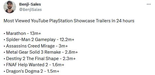 游戏新闻记者Benji-Sales统计了昨日PS展会各游戏预告片在Youtube上的播放量,该数据统计范围为24小时。一起来看一下是哪些游戏引起了国外玩家最多关注呢。