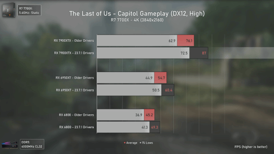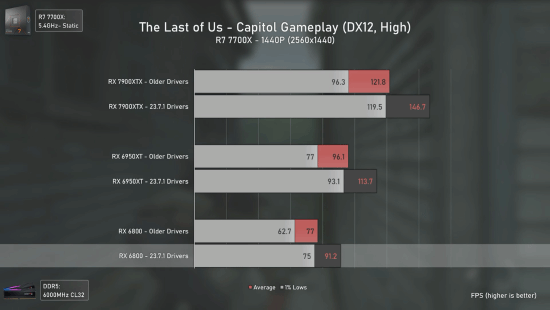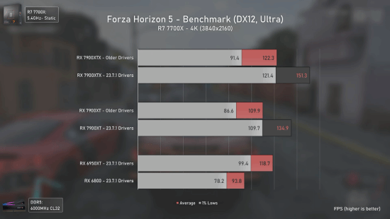 在用RX 7900 XTX运行1080p《地平线5》,其他驱动的平均帧为174.5FPS,而新驱动直接提升至230.3FPS,约32%的性能提升。RX 7900 XT则是130.3提升到218fps,性能猛增67%。同样的,在2K和4K分辨率下,游戏的性能也是有不同程度的提升。