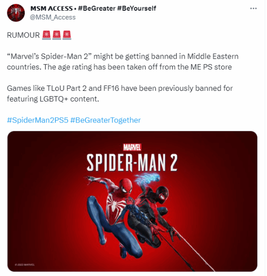 日前,有博主反映《漫威蜘蛛侠2》可能会在中东国家被禁,其年龄分级已经从当地PS商店撤下,玩家也无法预购这款游戏。原因可能和其中的LGBTQ 内容有关,此前《最后生还者2》《最终幻想16》等也因为同样的原因被禁。