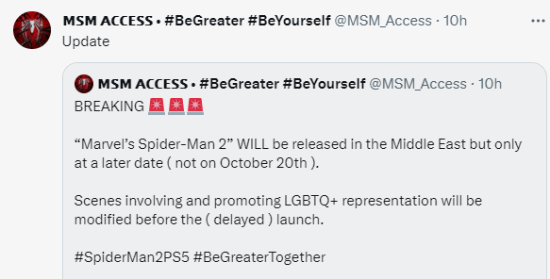 后来有玩家发现,该作又重新在PS商店上架了。该博主后来也更新表示《漫威蜘蛛侠2》能在中东地区发售,但会有延迟,不会在10月20日推出。涉及和宣传LGBTQ 内容的场景将在发布之前进行修改。