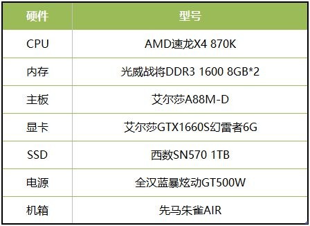 结合《命运方舟》的游戏需求,我们准备了一套能够畅玩该作的游戏配置。在硬件的搭配上,这套配置使用了AMD的速龙X4 870K处理器以及GTX1660S显卡,内存和固态方面分别是16GB的DDR3内存和1TB的NVMe M.2固态,性能方面完全可以满足《命运方舟》以及其它单机网游的需求,而且组建成本也是相当低,性价比很高。此外,这套配置还使用了老牌厂商艾尔莎的主板和显卡,品质和稳定性方面很有保障。