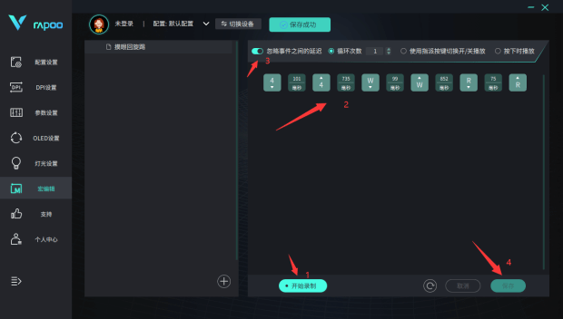 步骤二:点击界面右侧的“开始录制”,并打开“忽略事件之间的延迟”,点击“保存”。即完成了一组宏命令设置。