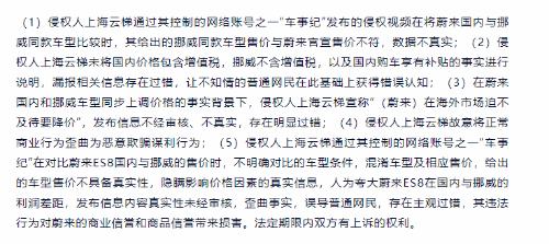 今日,蔚来法务部发布法院一审判决结果:判定上海云梯信息科技有限公司(法定代表人陈亚生)(“侵权人上海云梯”)在其控制的网络账号之一“车事纪”连续三十天置顶发布向蔚来的致歉声明,同时在判决生效十日内赔偿蔚来经济损失人民币三十万元。
