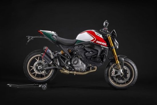 官方资料显示,该车基于最新的937ccMonster打造而来,采用了非常醒目的三色涂装,并配备有专属的金色轮辋和欧林斯NIX30前叉。