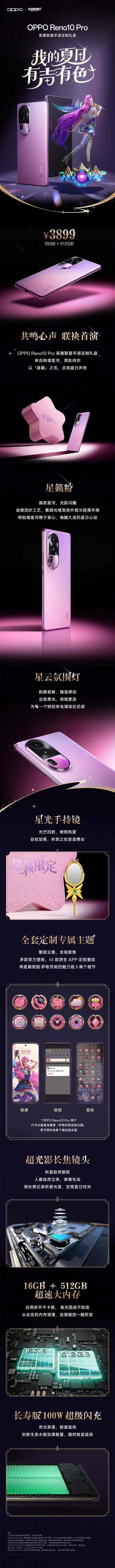 OPPO官方今日宣布,OPPO Reno10 Pro英雄联盟手游定制礼盒正式上市,售价3899元。礼盒版采用的配色为星籁粉,《英雄联盟》中的角色星籁歌姬萨勒芬妮代言。