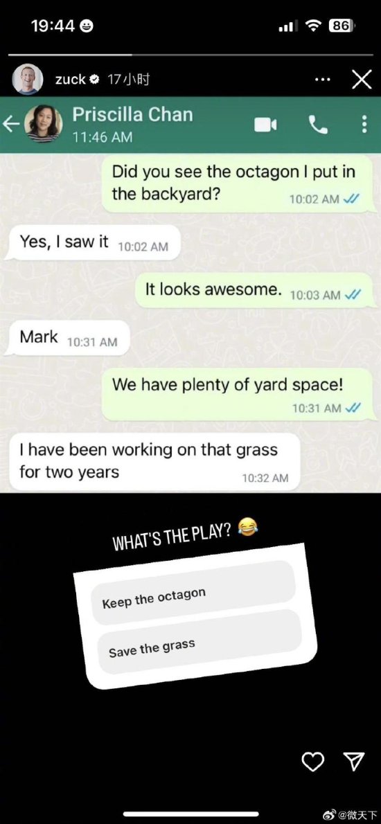 当地时间周三,扎克伯格发布了一则自己和妻子普莉希拉·陈在WhatsApp上的对话截图。图片显示,扎克伯格问妻子:“你看到我放在后院的八角笼了吗?”