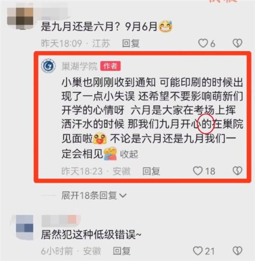 对此,巢湖学院回应称:“可能印刷的时候出现了一点小失误,还希望不要影响萌新们开学的心情呀。”还表示:“六月是大家在考场上挥洒汗水的时候,那我们九月开心的在巢院见面啦。”