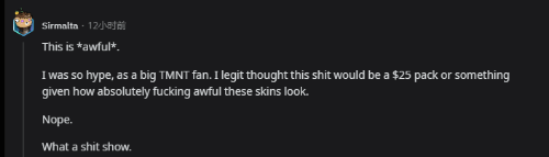 “太糟糕了,作为忍者神龟粉我本来挺兴奋的,但这些皮肤看起来太差劲了,还要每包花25美元。”