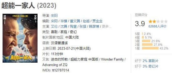 《超能一家人》豆瓣评分终于没能顶住压力,跌破4分,掉至3.9分,共有43.2%的观众打出1星,27.8%的观众打出2星。好于2%的喜剧片。