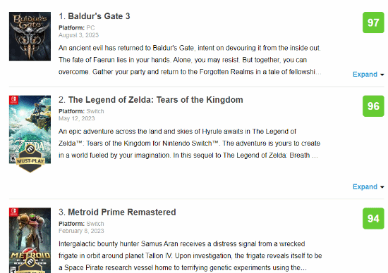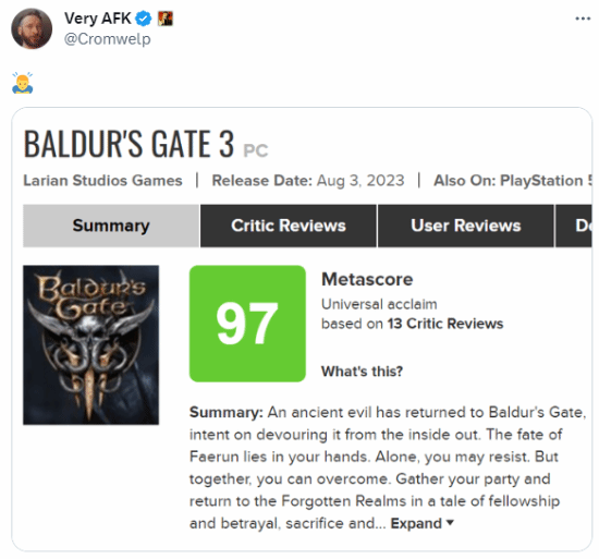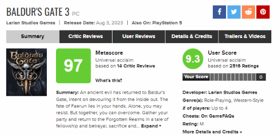 随着媒体评测的逐渐增加,《博德之门3》在M站已经涨到了97分,成为目前2023均分最高的游戏。但需要注意的是虽然评测数量多了,但目前也仅有14篇,更稳定分数还需评测基数更大一些。