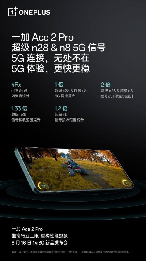 一加 Ace 2 Pro支持超级n28 5G、n8 5G信号。超级n28 5G、n8 5G是运营商大力推行的5G频段,去年移动率先完成n28基站布局,今年联通也逐步完成n8基站布局,电信、广电也有接入,真正实现了全国覆盖。