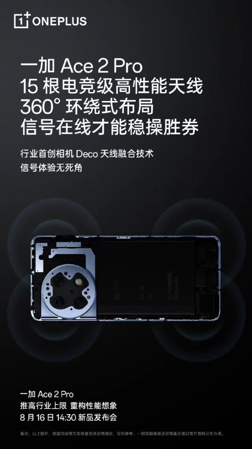 另外,一加 Ace 2 Pro 的天线网络也是专业电竞级别。15 根高性能天线,360° 环绕式布局,行业首创「相机 Deco 天线融合技术」,以及双「黄金游戏天线」设计,信号体验全方位在线,游戏才能稳操胜券!更有 LinkBoost 4.0,针对多种网络场景优化,支持 5G 双卡双待双通,上网、游戏、通话互不干扰!