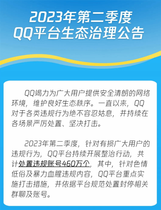 QQ安全中心发布《2023年第二季度QQ平台生态治理公告》,2023年第二季度,针对有损广大用户的违规行为,QQ平台持续开展整治行动,共计处置违规账号460万个。
