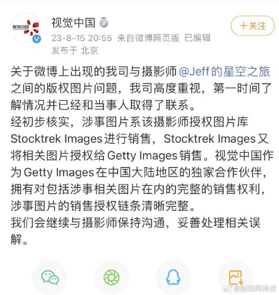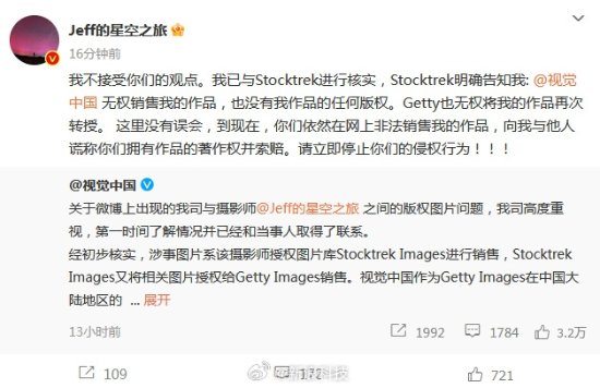 8月15日,视觉中国发博文回应:关于微博上出现的我司与摄影师Jeff的星空之旅之间的版权图片问题,我司高度重视,第一时间了解情况并已经和当事人取得了联系。