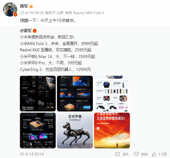在之前的小米年度新品发布会中,雷军为我们带来了小米MIX Fold 3、Redmi K60 至尊版、小米平板6 Max 14寸等多款新机。今日,雷军也在微博提醒:今天上午10点首发。感兴趣的朋友可以前往小米商城或各大电商平台选购。
