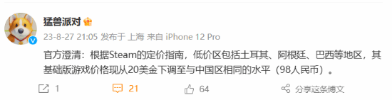 而《猛兽派对》官方发文澄清:根据Steam的定价指南,低价区包括土耳其、阿根廷、巴西等地区,其基础版游戏价格现从20美金下调至与中国区相同的水平(98人民币)。 ???